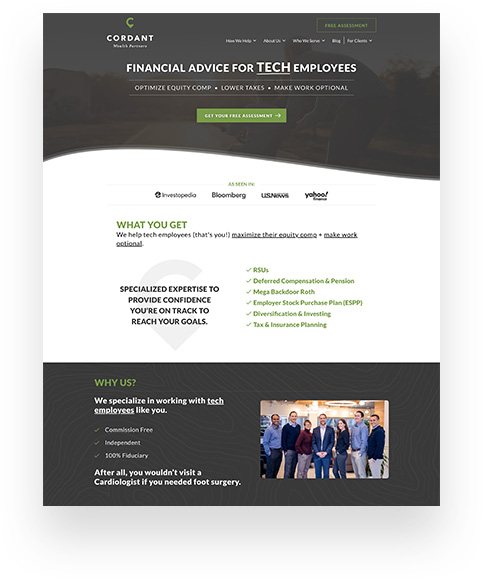 Focused on displaying Cordant Wealth’s experience while still guiding visitors down the right path, we customized the home page design to highlight where Cordant Wealth has been featured and bring attention to the free assessment the firm offers.