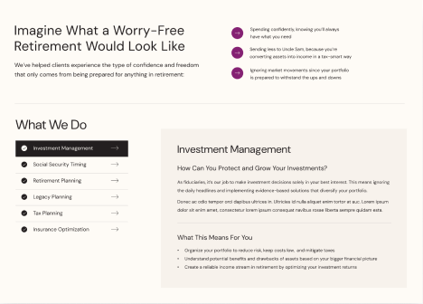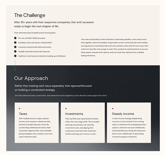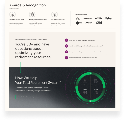They collaborated with our dedicated team to refresh their website’s design, content, and navigation to better reflect their expertise, unique Total Retirement System™ approach, and personalized financial solutions.