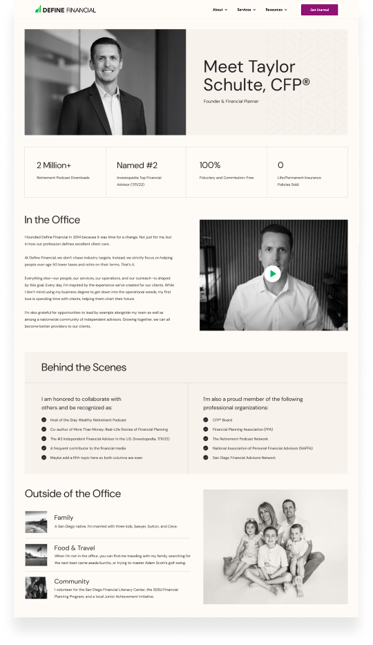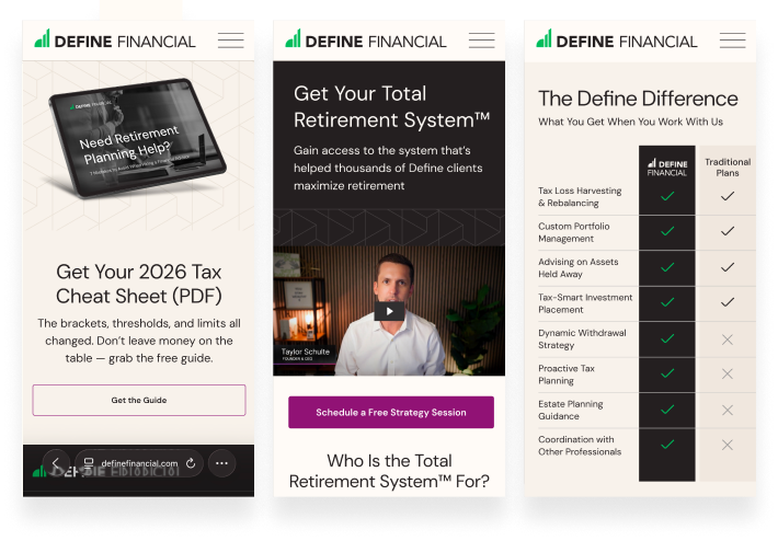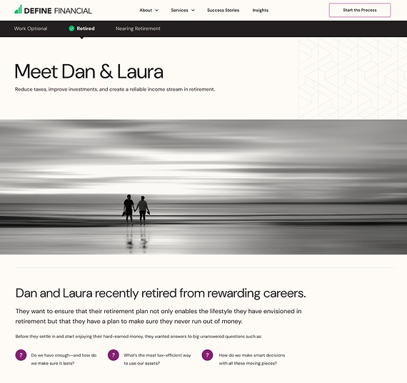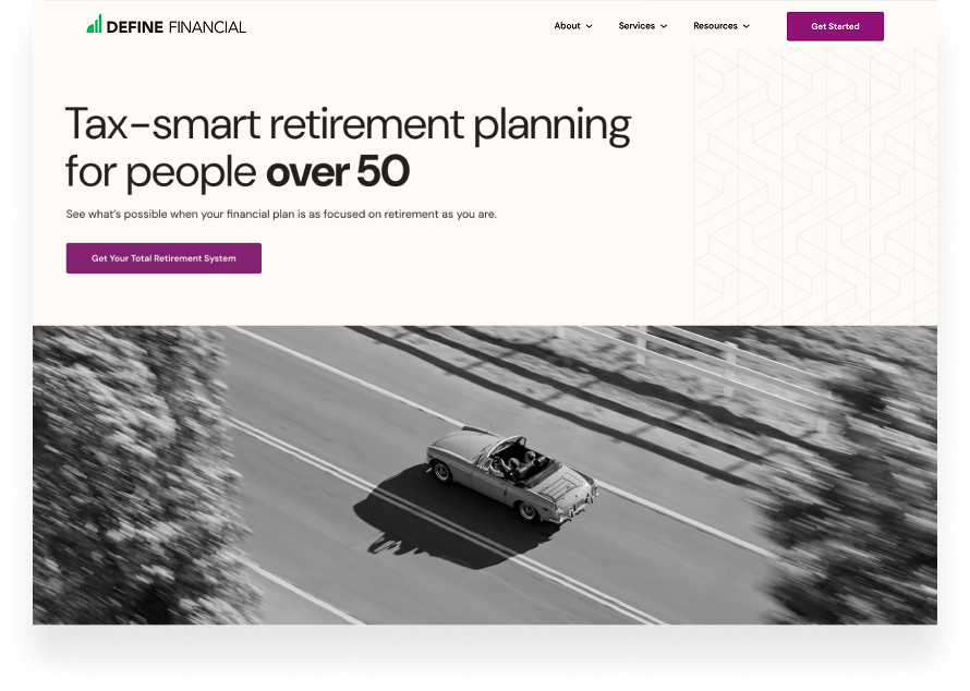 With a visitor-first approach, our web strategist, copywriter, and designer created a custom page that clearly outlines the services Define provides, making it easy for visitors to hone in on their top financial priorities.