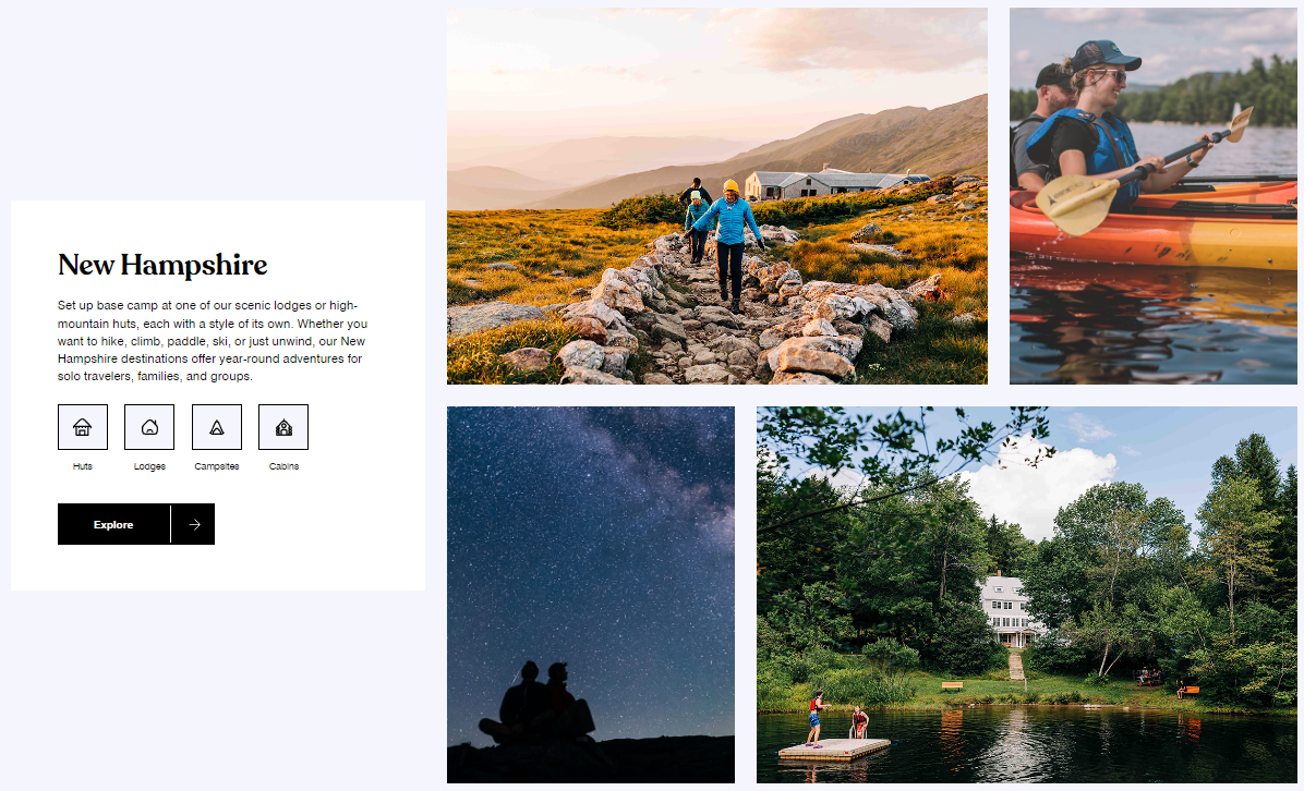 In the example below, Appalachian Mountain Club does a great job establishing an adventurous tone throughout their website by using a simple color palette, playful fonts and loads of beautiful images featuring different activities and locations.