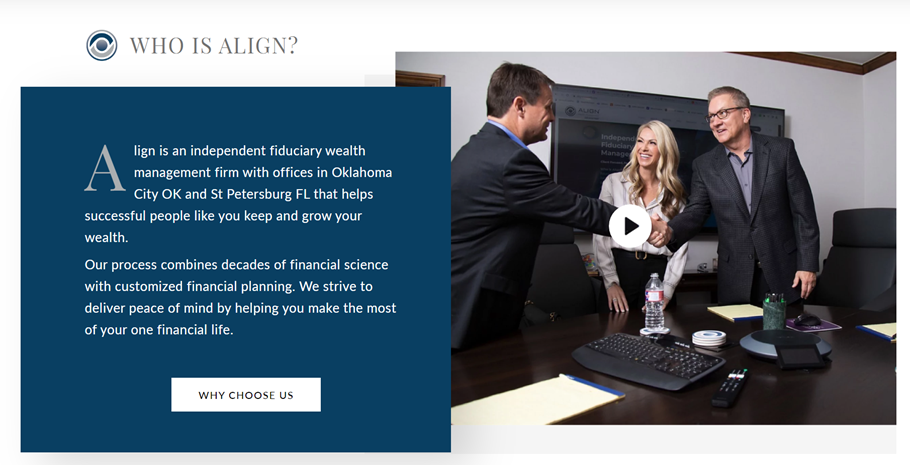 Align Wealth Management’s website was designed to emphasize the firm’s experience and sophistication. The site incorporates personal elements, including imagery and a video that features the Align team, while still maintaining their sense of professionalism.
