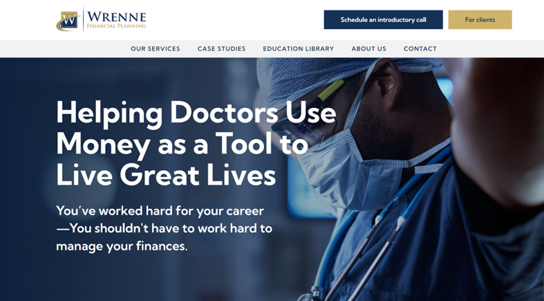 If people haven’t been to your website before, they’ll be looking for clues that you have the knowledge, experience, and products or services to help them. Wrenne Financial’s website design makes it clear from the start that they help doctors with their finances.